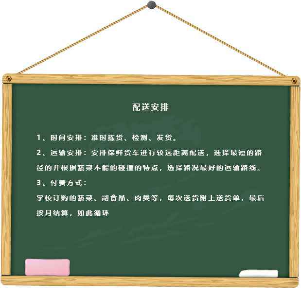 1、在与学校食堂签订《食品蔬菜配送合作协议》中,由学校食堂和我们共同拟订《食品蔬菜配送质量标准书》;